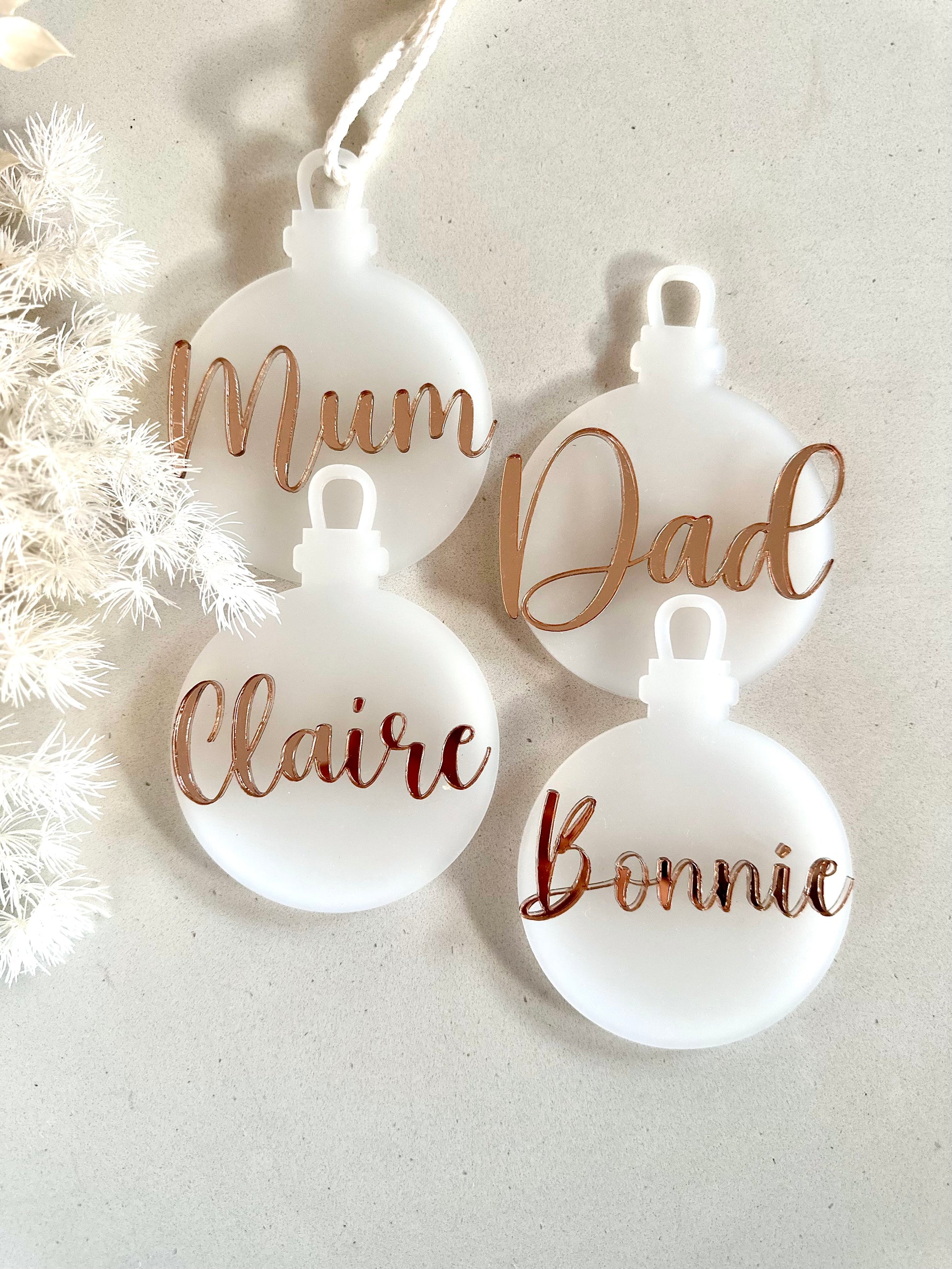 Each ornament is laser cut from 3mm premium acrylic for a sleek, modern look that pairs perfectly with any festive theme. The soft frosted finish gives a snow-kissed glow, while the mirror script catches the light for a subtle shimmer on your tree.